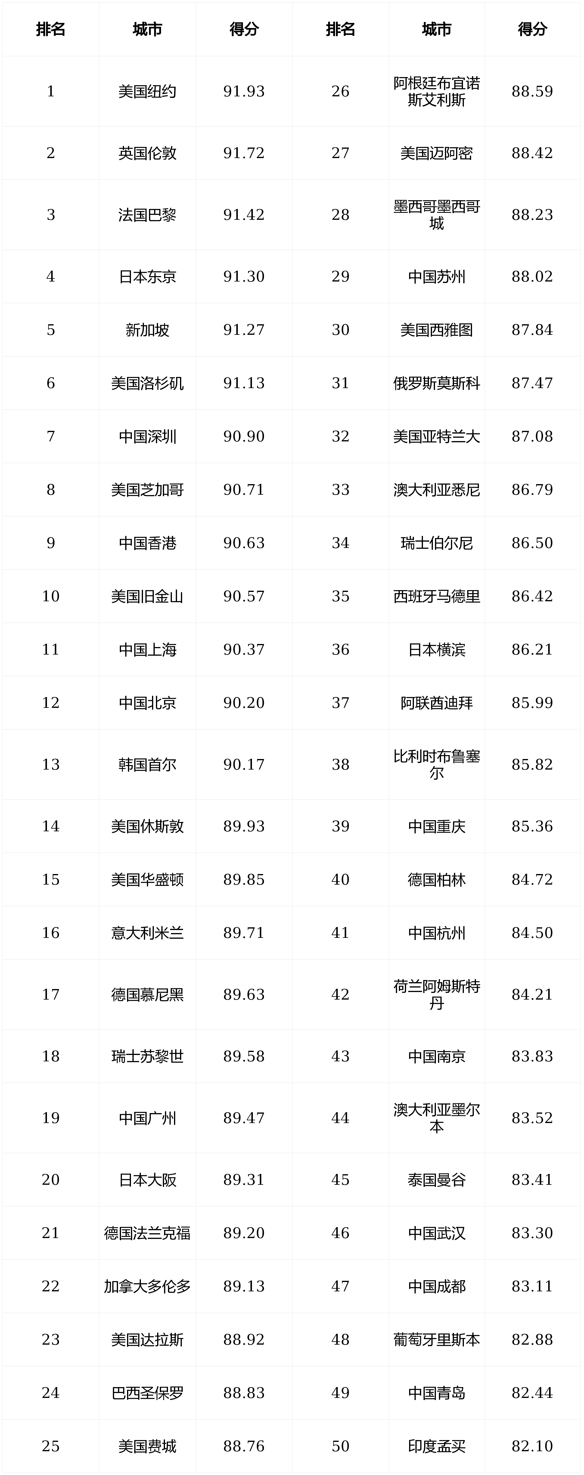 全球城市合作力指正在全球一体化和市场经济从导视阈下,一个城市经济实力、资本潜力、文化蕴力、科技动力、立异能力、张力、办理效力、平易近生保障等诸多要素分析而成的分析合作劣势。
